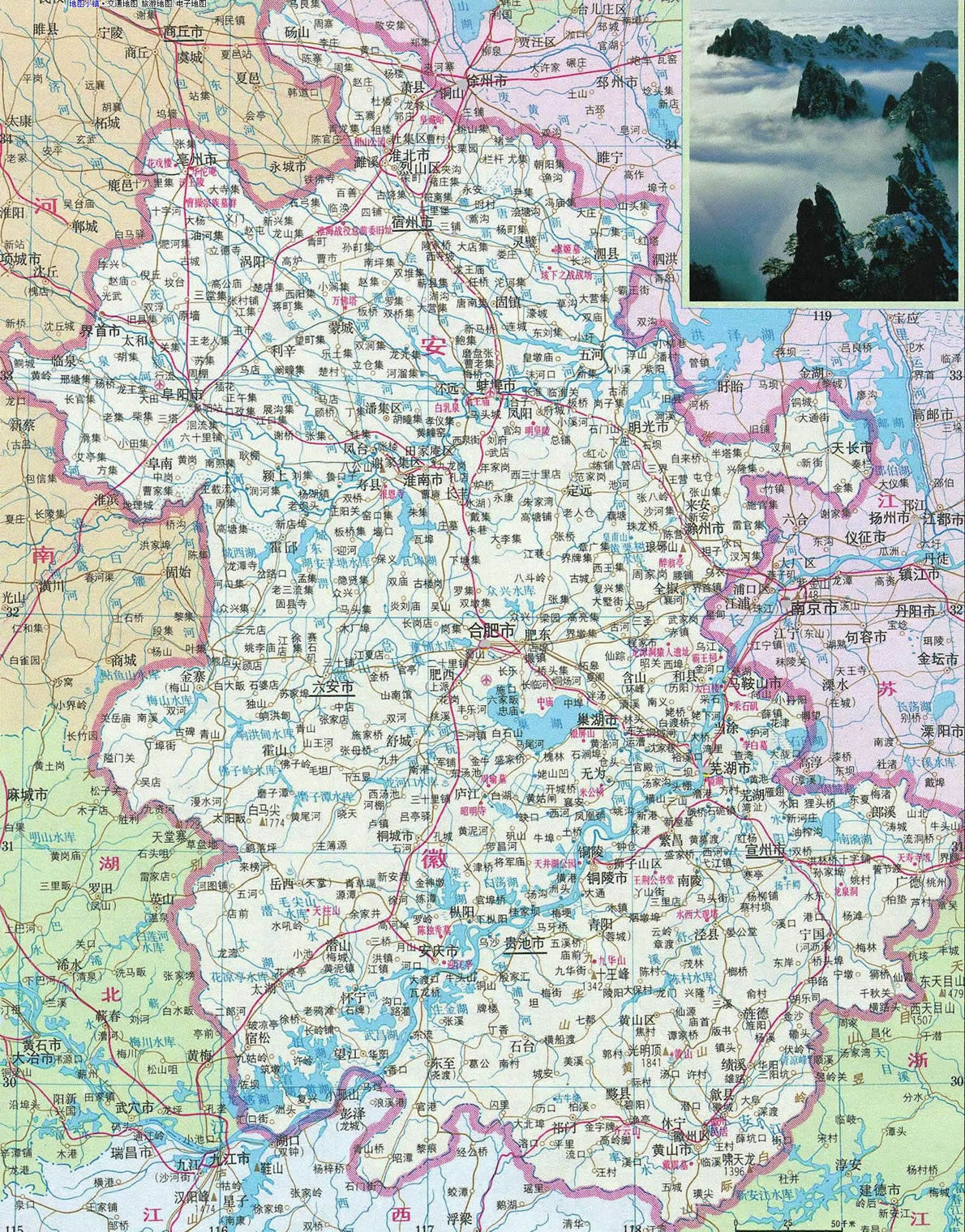 “兩根筷子夾著碗,屏障在西也在南,東面不平北邊平,黃山勝過九華山。”這首民謠形象地概括了安徽省的旅游地理面貌。兩條江河(長江和淮河)像兩根筷子,巢湖如碗,西面的大別山和東南面的天目山如屏,北邊是一馬平川的江淮大平原。而皖南的黃山、九華山則是安徽最有名的風景名勝區(qū)。