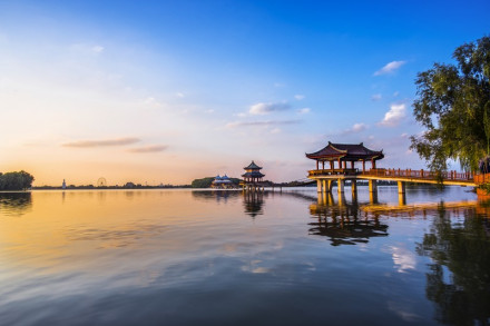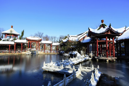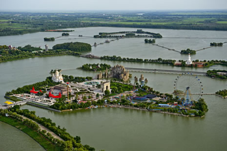 五冠橋位于旅游區(qū)主景觀帶的環(huán)湖路景觀帶上,它是根據(jù)揚(yáng)州瘦西湖五亭橋所建,因橋上建有五個(gè)亭子,便被稱(chēng)為“五亭橋”。景區(qū)內(nèi)的五亭橋把五個(gè)亭子改成了形狀如冠的形狀,其余均同五亭橋,所以又名“五冠橋”。