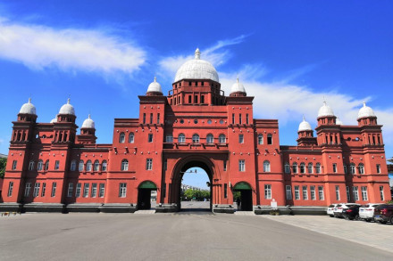 天下第一門(mén)是八里河旅游區(qū)的主園區(qū)大門(mén)。它綜合了俄、英、美三國(guó)的建筑特點(diǎn),造就了具有八里河藝術(shù)風(fēng)格的建筑,也是景區(qū)的標(biāo)志性建筑。這個(gè)樓堡式大門(mén)共有13個(gè)白色圓頂,中間一個(gè)較為突出,外墻飾有猩紅色的噴砂。