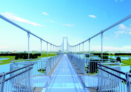 八里河懸空水上觀光玻璃天橋,全長(zhǎng)425米,寬3米,全高55米,采用全透明特種玻璃建造,像一條蜿蜒的飛龍盤(pán)旋在八里河水面之上。將9D聲光電碎彩屏、花鳥(niǎo)游魚(yú)立體特效等流行科技元素與橋面結(jié)合震動(dòng),同時(shí)還有音效。 |