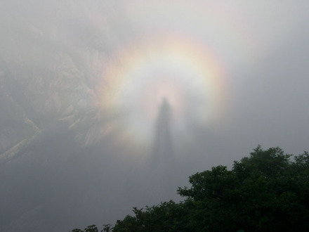 由于牯牛降獨(dú)特的地理及氣候條件,極易形成佛光,牯牛佛光清晰規(guī)整,顯現(xiàn)次數(shù)多,時(shí)間長。每當(dāng)雨過天晴,云霧匯聚之時(shí),陽光穿云透霧,灑向山谷,云海上常會(huì)懸起一輪五彩光環(huán),光芒四射,艷如花盤,繽紛柔和,仿佛一臺(tái)緩緩滾動(dòng)的佛輦,若隱若現(xiàn),妙趣橫生。通過陽光的作用,若游人奔跑跳躍,光環(huán)中的佛影也隨著舉手投足,配合默契,實(shí)為奇觀。