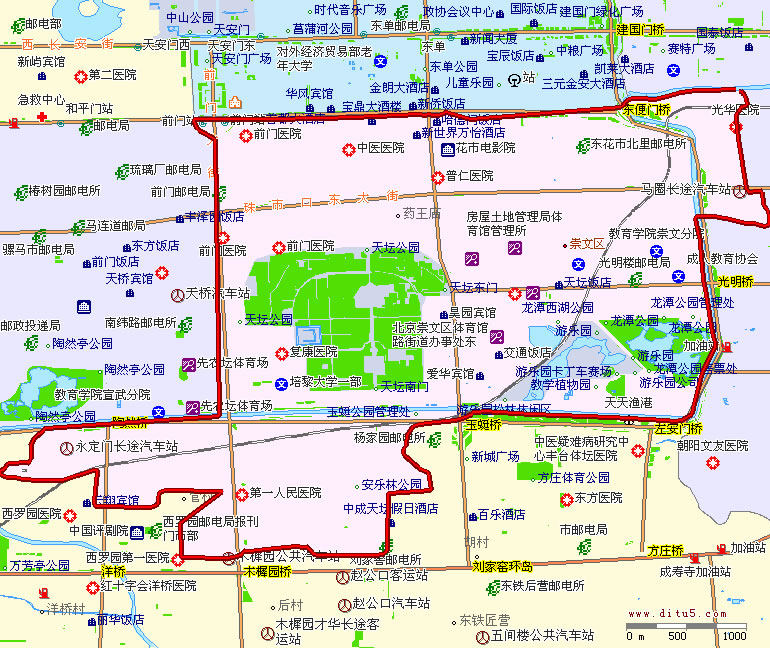 崇文區(qū)轄7個(gè)街道:前門街道、崇文門外街道、東花市街道、龍?zhí)督值馈Ⅲw育館路街道、天壇街道、永定門外街道。
