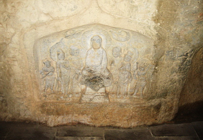 唐代摩崖造像 唐代摩崖造像位于張坊鎮(zhèn)大峪溝村東北,為房山區(qū)重點(diǎn)保護(hù)文物單位。造像在高3米、寬4米的青石斷面上,共有有摩崖造像2龕。左側(cè)一龕高0.88米,寬0.98米,中為佛祖釋迦牟尼坐像,兩側(cè)列眾弟子和金剛力士,頂部有二飛天,共有造像9尊,龕內(nèi)兩側(cè)有題記,左為“照一天下八月二十四日佛放光日豪護(hù)佛神王”,右為“護(hù)法力士”。右側(cè)一龕高1.7米,寬0.85米,龕內(nèi)只有一尊釋迦牟尼像端坐于須彌座上,佛祖面方口闊,雙目微睜,兩耳垂肩,衣衫寬松,左臂下垂,右手平置,雙腿垂下,足踐蓮花。石刻造像線條流暢,技法嫻熟。