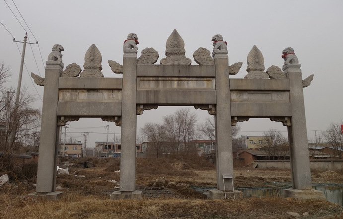 金成明墓石牌坊 金成明墓石牌坊位于青龍湖鎮(zhèn)北劉莊村東,是房山區(qū)文物保護(hù)單位。金成明,正史無(wú)考,據(jù)傳為乾隆皇帝的岳父。石牌坊建于清乾隆年間,坐北朝南,為四柱三門(mén)式石牌坊,艾葉青石質(zhì),面闊11.55米,明間寬4.20米,次間寬3.70米,四根方形通天柱寬0.6米。柱頂各雕刻有一小石犼,中間雕刻著三顆火焰珠,石坊中間刻有匾額。四周浮雕云紋與瑞獸。牌坊后有碑樓兩座,樓內(nèi)各有螭首龜趺碑記一座,東南側(cè)還有一塊無(wú)碑亭的小碑。