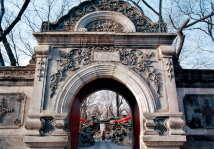 位于花園中路最南端,是花園的正門,稱“靜含太古”,為奕訢所建。門由漢白玉石雕砌,形制仿圓明園中大法海園門所建,西洋拱式風(fēng)格。門額外刻“靜含太古”,內(nèi)刻“秀挹恒春”,西洋門也是園內(nèi)唯一的西式建筑,可以體現(xiàn)出主人希望通過學(xué)習(xí)西方文化和技術(shù)來挽救清朝統(tǒng)治之意。這也是恭王府的三絕之一,另兩絕是大戲樓和后罩樓。