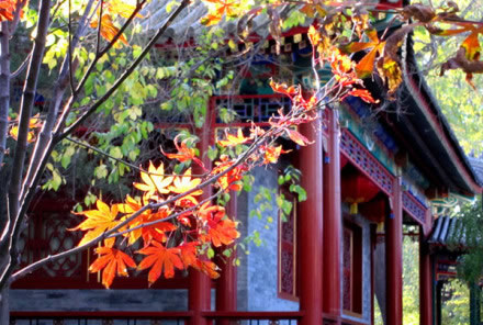 中路的蝠池,形似蝙蝠,汪汪一碧。春天到來的時(shí)候,池子周邊的榆樹結(jié)滿成串的“榆錢”,紛紛落入水中。這蝙蝠的“蝠”和榆樹的“榆”合起來,就是“富!钡闹C音。“圖必有意,意必吉祥”在造園中得到了靈活充分的運(yùn)用。