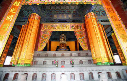 戒壇大殿:位于戒壇院內。始建于遼咸雍五年(1069),金元明清各代均有維修,現(xiàn)仍保持著遼代的建筑風格。大殿頂部四面呈坡形,正中間是一個正方形的小平臺。臺上安放有明成化十三年(1477)由僧人德秀捐贈的銅質鎏金寶頂,呈金剛寶座塔形分布。中間一個高約5米,四周四個較小。殿頂?shù)纳舷麻苤g有風廊環(huán)繞,兩層檐角均掛有風鈴,上圓下方。大殿外側四周有20根檐柱支撐,四面正中部分均配置有稱作“戒壇枋”的外枋門。正面門額上掛有“選佛場”匾額。殿內的橫枋上掛有清乾隆帝手書“樹精進幢”的匾額。橫枋內側掛有清康熙帝手書“清戒”二字的匾額。殿內天花板金漆彩畫.正中部分為“斗八藻井”,井內級深分為上下兩層。方形的井口內壁上四周雕有許多小天閣,閣內雕有小佛龕,龕內圓形小門洞內均有木雕漆金小佛像。藻井上層的圓形部分正中的穹頂上倒掛著一條木雕團龍,龍頭居于藻井中心,俯視下方。團龍四周的穹壁上還雕有八條“升龍”,合為“九龍護頂”。