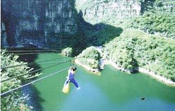 溜索飛降是登山探險(xiǎn)運(yùn)動(dòng)中,在通過懸崖、山澗、河流等地形時(shí)常用一種方法,F(xiàn)飛降裝置是經(jīng)改進(jìn)后,既安全又富有刺激,它容實(shí)用性和娛樂性于一體,在有驚無險(xiǎn)的情況下,既鍛煉了參與者的操作技能,又增強(qiáng)了他們的膽魄。龍慶峽飛降由國家登山隊(duì)承建,主要設(shè)備全部進(jìn)口材料,安全可靠,該項(xiàng)目在風(fēng)景怡人的龍慶峽內(nèi)兩山懸崖之間,上有藍(lán)天,下有碧水全長200米,兩山自然落差30米的下滑時(shí)可使娛樂者感受到在空中飛越的感覺。