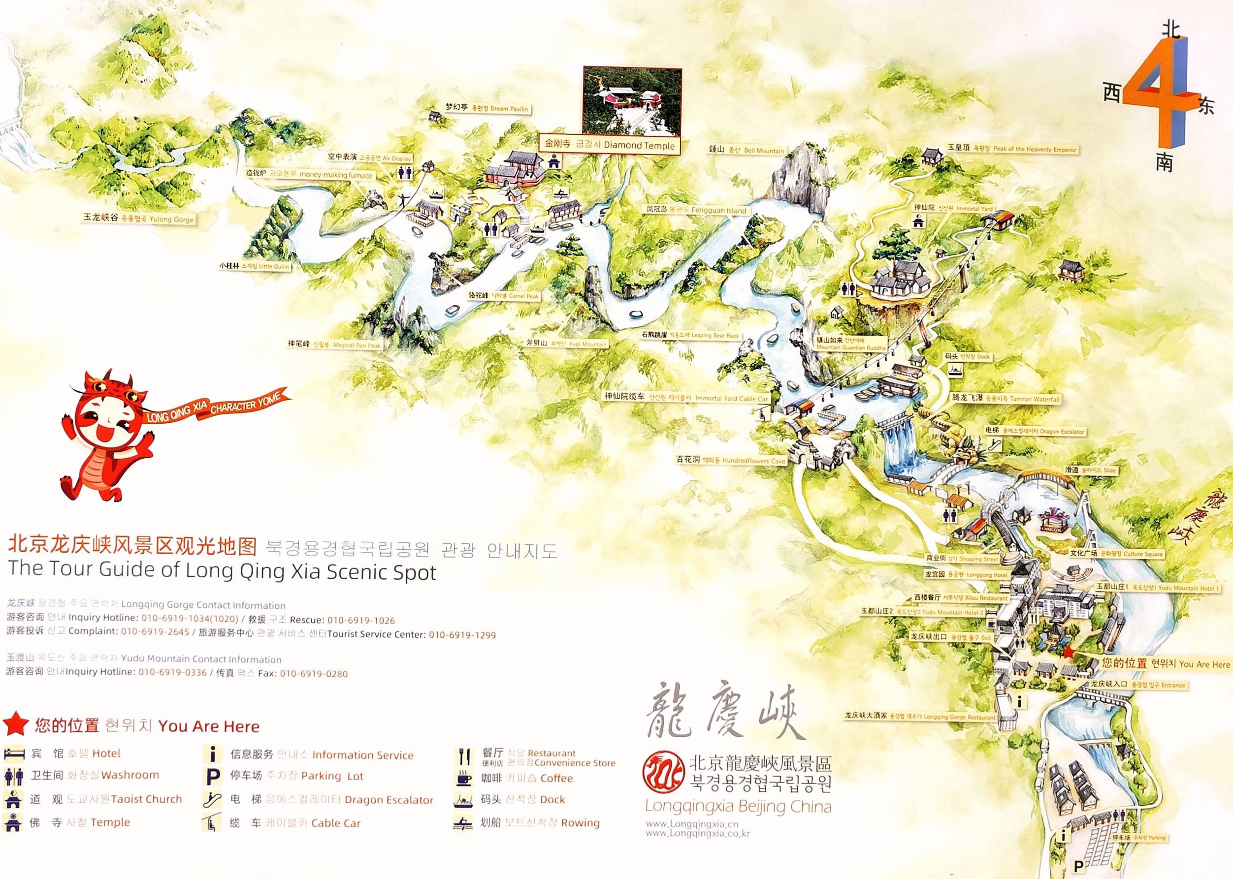 1986年北京評(píng)選十六景,得票居第十位,取其古地名兼寓龍騰之意,定名“龍慶峽”。龍慶峽南面為八達(dá)嶺長城,西北為松山森林公園,正西是海坨山。7月份平均氣溫比延慶縣城低2.9度,比北京城區(qū)低6.4度。在已開放游覽的7公里長的庫區(qū),共有20-30處景觀。游船駛抵“九曲湖”的一座小碼頭,可以棄舟登岸,沿山谷步行而上,有神仙院、仙人棋、老虎嘴等景點(diǎn)。