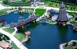 侗族建筑:侗族建筑景區(qū)占地4000平方米,建筑面積571平方米,建筑復(fù)原按貴州省從江、黎平地區(qū)的侗族典型建筑。規(guī)劃形式為寨,由鼓樓、風(fēng)雨橋、寨門、戲臺(tái)、民居、水車、碾房、谷倉、稻田等組成。侗族建筑以杉木為原料,民居形式為干欄式。