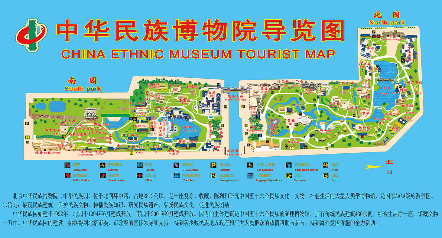 北京中華民族園,是集中國(guó)少數(shù)民族的傳統(tǒng)建筑、民族風(fēng)情,歌舞表演,工藝制作以及民族美食為一體的大型民族文化園地。園內(nèi)建有國(guó)內(nèi)最大伯鑄鐵雕塑以及仿真的熱帶榕樹林、水中溶洞,土林、盤龍瀑布,滄源巖畫、阿里山神木等。南園也已建成完畢,主要有民族博物館和雕塑廣場(chǎng)等大型設(shè)施,以及二十余個(gè)民族村寨。
