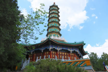 琉璃塔在香山公園宗鏡大昭之廟西部山腰,為該廟組成部分。清乾隆四十五年(1780年)建,高約30米,七級(jí)八角密檐式。塔頂安黃色琉璃寶瓶和八條檐脊。塔底由八面張開的傘蓋承托,周飾漢白玉雕欄。最下層為石砌八角形塔基。層層檐端綴有銅鈴。
