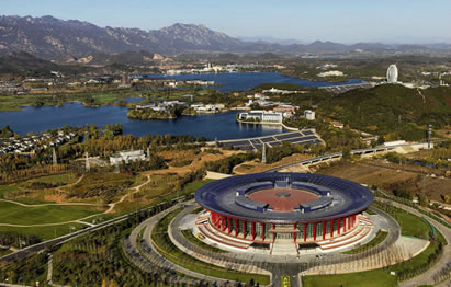 雁棲島(雁棲半島)會議中心主建筑是“漢唐飛揚”,岸邊的北京雁棲湖國際會展中心(屬雁棲湖國際會都區(qū)之一)主建筑是“天圓地方”,功能不同而配合。