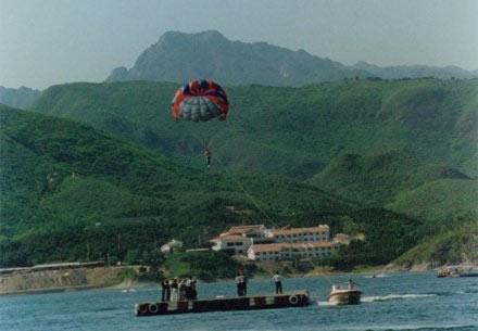 由泰國引進,跳傘平臺設(shè)在湖中,長40米,寬25米,總面積1000平方米。平臺浮在湖面上,由鐵錨固定在湖心。傘衣有兩種,可以根據(jù)游人的體重大小分別選用。游人在跳傘之前,平臺上穿好救生員和傘衣,傘衣由兩條高強度尼龍繩與傘和快艇相連,在快艇的高速牽引下,傘張開把人帶至空中,最高可達50米。隨著快艇的方向和速度,傘在空中時高時低,迂回曲折,在藍天碧水之間翱翔,湖區(qū)景色盡收眼底.