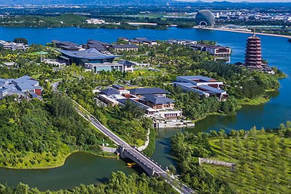 雁棲島上 核心是 雁棲湖國際會議中心。服務(wù)于大型會議。建筑主體是 “漢唐飛揚”,前面是夏園?偨ㄖ娣e4.2萬平方米,大小會議室、餐廳20余間,可以同時滿足近千人舉行會議和用餐。會議中心建筑內(nèi)部以H型為布局,功能核心區(qū)由位于一層的宴會廳——“鴻雁廳”和位于二層的會議大廳——“集賢廳”組成,兩側(cè)為貴賓大廳、休息區(qū)、大小會議室、包間等功能空間,宴會廳南側(cè)設(shè)室外宴會草坪,可以舉辦室外酒會等活動。