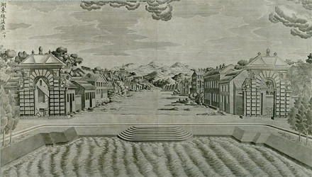 位于水木明瑟東面,是園中專門開辟的一座小城鎮(zhèn),仿照古印度橋薩羅國(guó)首都的城池布局而建,是供奉各種佛像和收藏佛經(jīng)的地方。城廓呈長(zhǎng)方形,南北長(zhǎng)、東西寬,四周筑有城墻,共辟4門。城內(nèi)街道呈十字形,內(nèi)建殿宇、房舍共326間,用游廊相連接;還建有數(shù)座金碧輝煌的牌樓。城前專門開設(shè)一條貫穿南北的買賣街,稱蘇州街,由宮中太監(jiān)扮作商人開市叫賣,法國(guó)教士王致誠對(duì)買賣街有比較詳盡的記載。