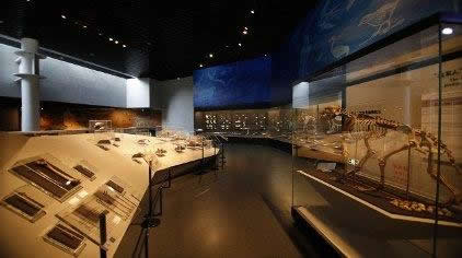 第三展廳主要介紹龍骨山上發(fā)現(xiàn)的二十余處脊椎動(dòng)物化石遺址和古人類活動(dòng)過的遺址分布點(diǎn),以及一件18000年前山頂洞人的遺物——串青貝殼,獸牙、小石頭制成的古老的項(xiàng)鏈。