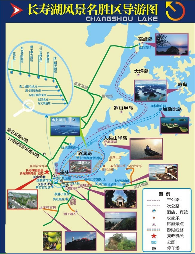 長壽湖是西南地區(qū)最大的人工湖,因1954年修建中國第一座自行設(shè)計、施工建設(shè)的大型水電工程獅子灘水力發(fā)電站形成湖泊。以長壽湖為核心,總面積266.73平方千米,其中湖面面積65.5平方千米,共有大小島嶼203個,是三峽國際旅游黃金線的重要節(jié)點。最奇特的景觀是在湖心區(qū)域有一處由19個島嶼、半島圍合形成的長1299米、寬699米、占地33公頃的“天賜壽島”,其形狀似魏碑體的“壽”字。整個景區(qū)以其“島湖風(fēng)光”“長壽文化”享譽四方,并以“長湖浪嶼”被評為巴渝新十二景之一。