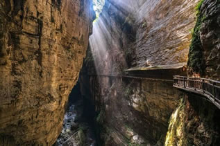 青天峽地縫全長1500米,最窄處不到2米,兩岸懸崖峭壁,高度300~700米,抬頭僅見天光一線。地縫中怪石林立,鐘乳石千姿百態(tài),兩壁峭崖有的地方僅隔數(shù)尺。當(dāng)雨過天晴或正午陽光朗照,陽光穿透地縫,與崖壁上的流水發(fā)生折射后會形成“一米陽光”奇觀。