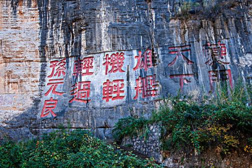 瞿塘峽摩崖石刻,位于重慶市奉節(jié)縣瞿塘峽口南岸白鹽山下的陡峭巖壁上,立面面積600平方米,共有自宋代以來(lái)的題刻十三幅,綿延180余米,鐫刻時(shí)間先后延續(xù)長(zhǎng)達(dá)七百余年。所有題刻均為陰刻,篆、隸、行、楷皆備,內(nèi)容涉及頌德、詠史、觀景等。表現(xiàn)出了書法的原有韻味,具有極強(qiáng)的藝術(shù)感染力,又由于地處三峽要沖,給整個(gè)長(zhǎng)江三峽增添了濃厚的文化色彩。