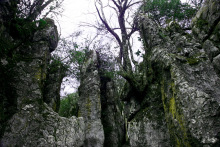 生態(tài)石林位于藥池壩南約1000米處,有一片郁郁蔥蔥森林掩蓋下的石林。巖石出露地表幾米或十幾米,石上苔蘚厚重,立石頂部、間隙雜樹(shù)叢生,黃楊、杜鵑、紅豆杉等繁茂生長(zhǎng),10公頃范圍內(nèi)若天然盆景園。