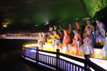 煙云洞位于三泉鎮(zhèn)觀霞山,海拔1040米。每至冬春,有白色霧氣從洞口飄散而出,故名“煙云洞”,形成于中生代三疊紀(jì),距今約1.8億年。洞內(nèi)鐘乳石密集,洞呈環(huán)形,長(zhǎng)800余米,進(jìn)、出洞口各一,下進(jìn)上出。進(jìn)口為人工開(kāi)鑿的拱形隧道,高2米,寬1.8米,長(zhǎng)27米。洞內(nèi)可分為金佛殿、水晶宮、千塔林、降龍洞、洗象池、九柱門廊、禹王執(zhí)圭、仙人田、金獅送客9個(gè)景段。出口為原生洞口,沿金佛殿洞壁斜上而出。