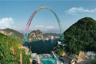 飛拉達是意大利文,是巖壁探險或鐵道式攀登的音譯,指在山體巖壁上建設(shè)由鋼扶手、腳踏、生命鋼纜等構(gòu)成的攀登徑道。龍缸景區(qū)飛拉達位于標識性景點云端廊橋左側(cè),距石筍河垂直高度700余米,攀登徑道全長600余米,主要由彩虹橋、鋼索、長空棧道、十二生肖秋千橋、空中圖騰柱、攀爬梯道組成,其中彩虹橋全長62米,因橋面板上繪制有不同色彩和風景而得名。鋼索橋長約41米,由一根走繩、兩根扶繩組成,走繩非常細小,刺激驚險。整個項目的錨固方式為采用化學錨栓錨固技術(shù)將鋼錨植入巖石1米多深,每一條鋼索的承重達到2噸左右。