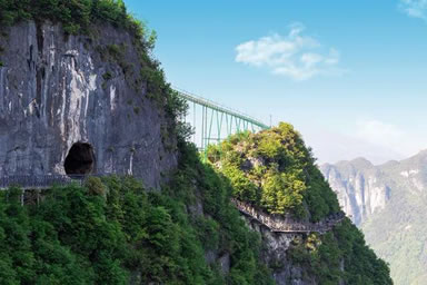 云端廊橋建在龍缸海拔1010米的絕壁之巔,懸挑長度26.68米,比美國科羅拉多大峽谷玻璃廊橋長5米多,位居世界第一。廊橋橋面、護欄采用全通透超白玻璃制作,可720度觀景。其造型設(shè)計、透視效果、驚險刺激程度全球領(lǐng)先。廊橋上每年要舉行世界低空跳傘大賽,人們可在驚險刺激的空中飄移中欣賞自然風光。