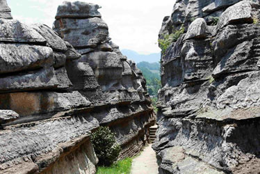 是因為巖溶塌陷,石頭斷裂而成的峽谷。石林東部并行排列三個石峽,分別稱為“蓮花峽、鳥鳴峽、聽泉峽”。三峽中最引人入勝的當數(shù)聽泉峽,長達300米左右,而寬則在1—2米之間,最深80米左右。站立其中,仰頭觀望,只見一線藍天,就像一綹藍帶飄過頭頂。兩邊懸崖若削,高聳壁立,氣勢恢宏。兩面絕壁,均由大小形狀相似、重達數(shù)十噸的巨石塊組成。石塊間縫隙規(guī)矩,有若人工而成的古城墻一般。無論什么時候,都有水滴從巖壁上不停歇地滴落。這時候,不管外面溫度多高,這里都涼意襲人。
