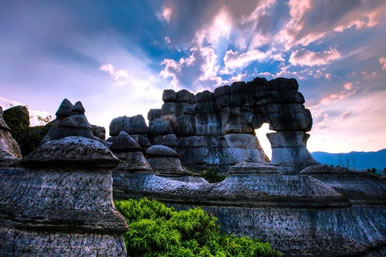萬盛石林景區(qū),不僅怪石林立,且地下溶洞景觀遍布。主要為水平溶洞和垂直溶洞兩種。水平溶洞有天門洞、過街樓溶洞、涼風洞、仙女洞、關馬洞、偷牛洞、九龍洞、觀音洞等。其中,數(shù)天門洞景觀獨特,造型別致,洞內石筍、石柱、石花、石幔,吊、立、鉗,各盡其志,如玉器晶瑩,如宮殿輝煌?芍^“天造地設,鬼斧神工”。