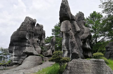 在香爐山背面,有一塊面積逾一平方公里的石頭城。仔細一看,這些石頭都象一座一座塔,參差不一,層數(shù)不一,最高的有八層,高二十余米;最起碼也有兩層,與人高低相近。他們形狀與人工堆砌的塔極相似,有基座,有沿有頂。近百座這樣的塔擁擠在一起,人穿行其間,迷離難尋歸途。因其數(shù)量多,便被游人譽為“千塔城”。