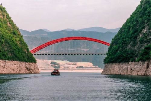 龍門(mén)大橋位于小三峽龍門(mén)峽峽口,在三峽水庫(kù)最終蓄水后,老龍門(mén)大橋主拱圈有三分之二以上部位被淹沒(méi),橋下凈空不能滿(mǎn)足通航要求,因此拆舊橋建新橋。新龍門(mén)大橋與巫山長(zhǎng)江公路大橋形成姊妹橋,遙相呼應(yīng)。巫山新龍門(mén)大橋位于巫山縣城旁,舊龍門(mén)大橋下游90米處的龍門(mén)峽峽口。大橋主跨采用240米鋼管混凝土中承式拱橋一跨跨過(guò),路線(xiàn)全長(zhǎng)855.911米。其主要工程量為鋼材2900噸和混凝土1.39立方米。全橋共兩拱肋,每肋13節(jié)段,11道橫撐,采用纜索無(wú)支架吊裝成拱。