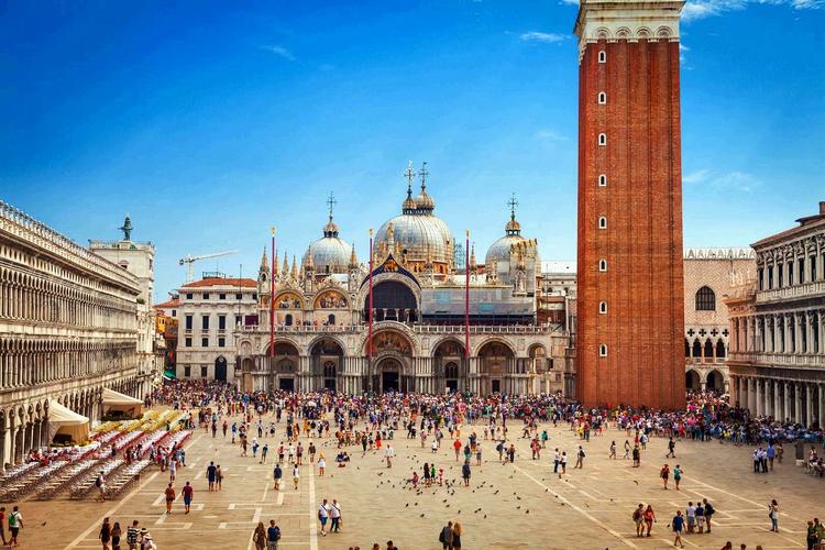 圣馬可廣場 圣馬可廣場(Piazza San Marco) ,官方標準譯名圣馬爾谷廣場,又稱威尼斯中心廣場,一直是威尼斯的政治、宗教和傳統(tǒng)節(jié)日的公共活動中心。圣馬可廣場是由公爵府、圣馬可大教堂、圣馬可鐘樓、新、舊行政官邸大樓、連接兩大樓的拿破侖翼大樓、圣馬可大教堂的四角形鐘樓和圣馬可圖書館等建筑和威尼斯大運河所圍成的長方形廣場,長約170米,東邊寬約80米,西側寬約55米。廣場四周的建筑從中世紀到文藝復興時代都有。 圣馬可廣場初建于9世紀,當時只是圣馬可大教堂前的一座小廣場。馬可是圣經中《馬可福音》的作者,威尼斯人將他奉為守護神。相傳828年兩個威尼斯商人從埃及亞歷山大將耶穌圣徒馬可的遺骨偷運到威尼斯,并在同一年為圣馬可興建教堂,教堂內有圣馬可的陵墓,大教堂以圣馬可的名字命名,大教堂前的廣場也因此得名“圣馬可廣場”。