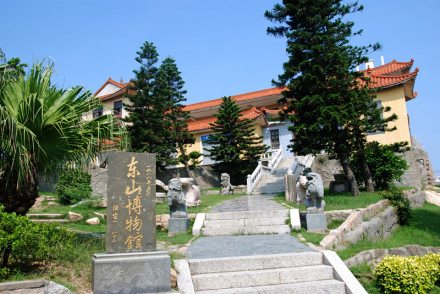東山博物館,1988年6月開館,1995年3月建成三層樓新館,建筑面積986平方米,占地1400多平方米,館內(nèi)設(shè)有“文物室”、“閩臺史前文化關(guān)系陳列室”、“陳洪甄書畫室”、“東山建縣八十周年建設(shè)成就回顧展“等展室。展出舊石器時(shí)代、新石器時(shí)代以及歷代文物、圖片、拓片等700多件。其中有東山人“化石”,萬年前舊石器、各種動(dòng)物(鹿、熊、象、犀牛、羊)化石,還有石器、銅器、陶瓷器、玉器、木雕、古今兵器、書畫、民俗文物及一艘從臺灣飄來的臺灣高山族獨(dú)木舟等。