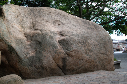 人們常說,到了閩南,不到東山,是一件憾事;而到了東山,不到風(fēng)動(dòng)石,則更是一大憾事。的確如此。 風(fēng)動(dòng)巨石聳立在陡崖上,高4.37米,寬4.47米,長4.46米,重約200噸,上尖底圓,狀似仙桃,巍然“擱”在一塊臥地凸起且向海傾斜的磐石上,兩石的接觸面僅為十余平方厘米?耧L(fēng)吹來時(shí),巨石輕輕搖晃不定,人若仰臥盤石上,蹺起雙足蹬推,巨石也搖晃起來,但又不會倒下。人們站在風(fēng)動(dòng)石下面,有一種驚險(xiǎn)的感覺,嘆為天下奇觀,故名“風(fēng)動(dòng)石”,詩曰:“風(fēng)吹一石萬鈞動(dòng)”。東山風(fēng)動(dòng)石因其“奇、險(xiǎn)、大” 的特點(diǎn)而被載入《中國地理之最》,譽(yù)為“天下第一奇石”。