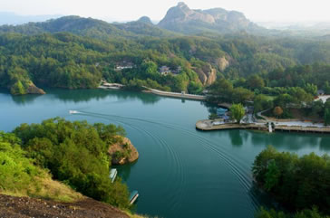 九龍湖景區(qū)左起云霄巖,右連竹安寨,面積10.84平方公里,湖水碧波蕩漾,幽深湛蘭,庫區(qū)水路迂回曲折,兩岸丹霞山巒陡峭,山奇水秀,遠(yuǎn)看湖上群山如游龍戲水,近觀壩下湖水如玉女散珠。