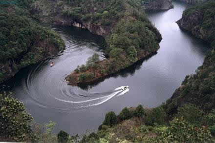 冠豸山東南有石門湖,潭深壑淺,湖清山秀,酷似一塊翡翠鑲嵌在冠豸山的奇峰險(xiǎn)壑之中。登艇游覽,山環(huán)水繞,沿途可欣賞“渴馬飲泉”、“大象戲水”、“猴猻撞鐘”、“三姐妹石”、“瘋僧戴帽”等勝景。