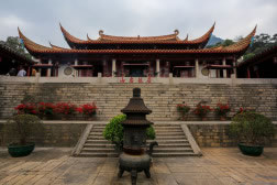 涌泉寺位于鼓山之上,占地約1.7公頃,仍保持著明清的建筑風格。寺依山偎谷,檻廊連綴,25座大小殿堂簇擁著大雄寶殿。大雄寶殿巨柱聳立,飛檐凌空,雄偉輝煌。殿內(nèi)釋迦牟尼三世佛不著梵服,只披漢裝,端坐其中;兩旁十八羅漢神態(tài)各異,“法相莊嚴”。