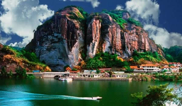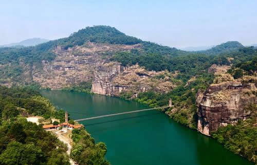 桃源洞因盛產(chǎn)栟櫚樹(shù),古有栟櫚山之稱。風(fēng)景區(qū)起始于唐代,五代后晉年間建有寺廟,到了明代風(fēng)景區(qū)得到較大的發(fā)展。南宋宰相李綱和左正言鄧肅及明代大旅行家徐霞客都曾在此駐足并留有詩(shī)句。明代萬(wàn)歷年間(公元1605年)當(dāng)?shù)匕采叭藘煽に抉R陳源湛捐資建有亭、臺(tái)、樓、閣十余處,取“世外桃源”之意改名為桃源洞,并在入口處120米高的赤壁上刻有“桃源洞口”四個(gè)大字,從此桃源洞名聞遐邇。這里丹霞地貌形成了眾多的奇峰峭壁,綠海林濤和碧水丹山。