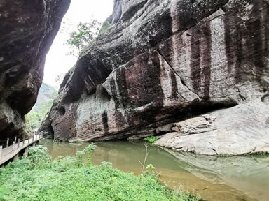 下邊有座石拱橋,長(zhǎng)約4米,寬2米,明萬(wàn)歷年間,陳源湛所建,是至今保存最完整的古跡之一。巖壁刻有“跨虹橋”三字,因顏如丹色,形狀似彩虹而得名。