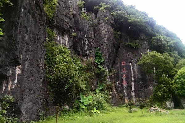 特殊地貌形成兩邊懸崖對(duì)峙,這條小澗叫桃花澗,從景區(qū)深處流出,我們的游路也將沿著高山峽谷的縫隙向內(nèi)延伸。桃源洞本沒(méi)有“洞”,無(wú)論是步行,還是泛舟游覽,都給人一種洞口的感覺(jué)右壁的懸崖高達(dá)120米,“桃源洞口”四個(gè)大字刻在36米高處,是明萬(wàn)歷年間,辭官回永安的名士陳源湛于1605年所題,每字兩米見(jiàn)方。