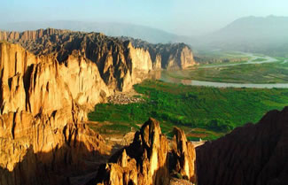 第一次看到黃河石林,便被它那氣象萬千、雄渾壯觀的景象所震撼。黃河石林與國內(nèi)其它知名景區(qū)相比,以古、奇、雄、險、野、幽見長,充分體現(xiàn)了粗獷、雄渾、樸拙、厚重的西部特色,使游客在回歸自然、領(lǐng)略奇異風(fēng)光的同時,陶冶性情,修養(yǎng)身心。徜徉于黃河石林景區(qū),但見長河抱日,峨峰接云,石林聳奇,危崖橫斷,河映崇山,曲流回旋,平疇十里,小村安臥,老屋舊椽,新灘故道,濃蔭鋪地,綠蔽河灣,繁棗滿枝,瓜果溢香,水車唱晚,浪遏皮筏,真乃世外桃源。若沒天橋古道拾級登上南山之巔,則峰林、曲流、綠洲、戈壁盡收眼底,讓人心曠神怡。而滄桑之變中不曾嬗變的原始力量,峽谷間透出的窮靈,陽光里蕩溢的繁麗,又教人于感悟時慧眼頓開。至于觀音崖的兇險,老龍溝的深邃,盤龍洞的神奇,清涼寺的幽寂,還有環(huán)村十溝的撲朔迷離和峽谷內(nèi)景象萬千、古韻猶存的石林峰柱的磅礴氣勢,以及整個34平方公里景區(qū)內(nèi),山的夢幻、河的靈秀,綠洲的靜謚,戈壁的逍遙,不僅令人在沉思遐想中忘卻煩憂,超脫塵俗,更能引人向上,催人奮進。