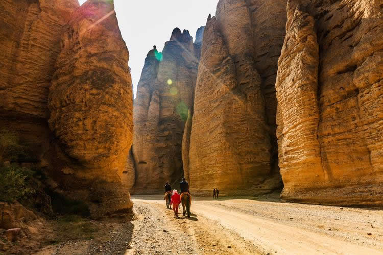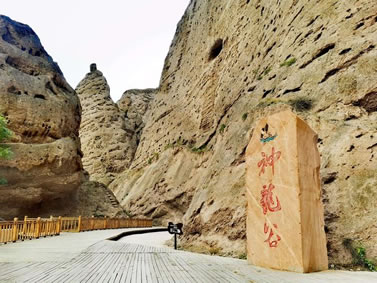 這里的石柱石筍大多高達八十至一百米之間,最高達二百多米,均由橘黃色砂礫巖構(gòu)成,鬼斧神工,猶如雕塑大師之夢幻杰作。我們左行至飲馬溝入口,換乘當?shù)剞r(nóng)民裝扮得極富民俗風(fēng)情的驢車前行。進入峽谷,兩邊布滿了巨大的石筍、石人、石鐘、石崖、石窟,峰回路轉(zhuǎn),步移景變,人們將石景命名為:大象吸水、千帆競發(fā)、伴侶駝、“黃河母親”等等,其形神兼?zhèn),栩栩如生?/p>