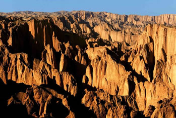 石林則依著黃河的彎轉(zhuǎn),藐著黃河的水流,這個場面保持著一種驚心動魄的興奮,一看就是飛逝而去的千萬年啊,千萬年。老龍灣像一條長長的、波光粼粼的跑道,黃河拍打著細浪,從聳立的石林中,陡峭的巖石旁流過去,固執(zhí)地向干涸遙遠的北方挺進。風(fēng)吹過,水涮過,千萬年的歲月,靈動和冥想,一路歌舞狂歡。突然一剎那就是永恒。停在那里回轉(zhuǎn)的頭型,飄飛的發(fā)絲,閃逸的裙裾一下子被動結(jié)了,面目間的笑意還沒有來及抹去。假如有一天,您也來到石林,是否會為這一片晴朗而遼闊的天空下毫無造作、天然凝就的靈魂而感動和震撼?大自然的神筆飛揚,你縱然放開想象,馳騁神思。望尖銳或圓錐狀的山峰,基部相連的簇狀,是石林發(fā)育地貌形態(tài)。只要能夠聯(lián)想到的物象,毫無例外活生生矗立在你的眼前,仰觀景慕,活靈神現(xiàn);你沒有想到的也一幕幕向你襲來,目不暇接。山峰如聚,峰嶺沸騰了一般,黃河石林以它非石非巖的特質(zhì),在這塊土地上托起一個立體的神話。雅丹、丹霞、峰林為一體的地貌奇觀寫意了恢弘的場景,刀鋒擁擠,千軍涌動,萬馬奔騰,這儼如一個拼殺的戰(zhàn)場,風(fēng)行走其間鼓動著金屬碰撞的鏗鏘,它不再是一個夸張的舞臺,場面不再是一個宏大的舞池。穿越石林,我們不自主地感知黃土高原的陽剛的軀身,緘默的神態(tài),堅毅的面容,它在風(fēng)雨中矗立,日復(fù)一日,從不愿放棄對大地的眷戀,對太陽的向往。