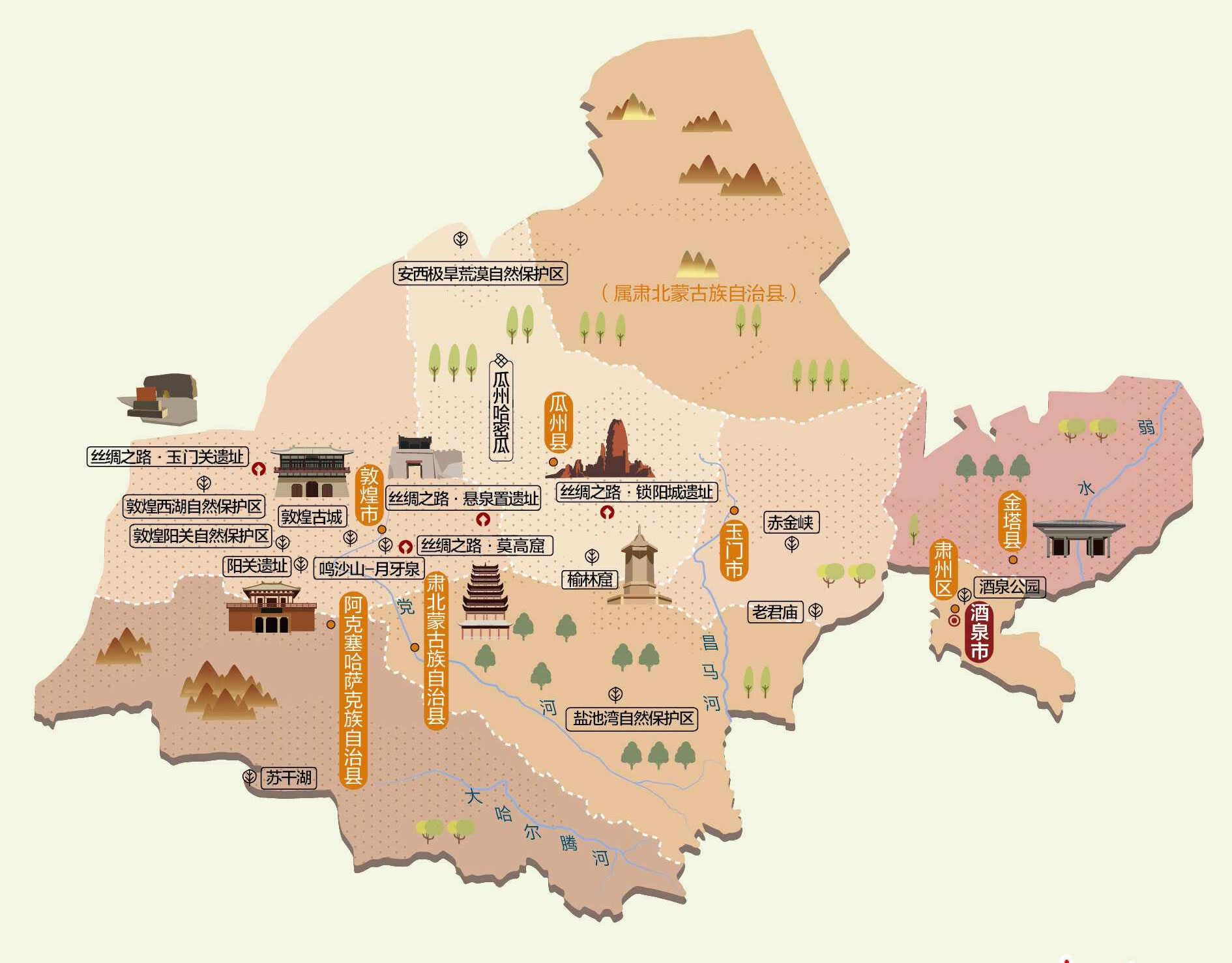 酒泉市為漢代河西四郡之一,絲綢之路的重鎮(zhèn),因“城下有泉”、“其水若酒”而得名。酒泉市是敦煌藝術(shù)的故鄉(xiāng),現(xiàn)代航天的搖籃、新中國石油和核工業(yè)的發(fā)祥地、“鐵人精神”的誕生地。先后獲影響世界的中國文化旅游名城、中國最具國際影響力旅游目的地等榮譽(yù)稱號。酒泉市境內(nèi)有敦煌莫高窟、安西鎖陽城、酒泉公園、敦煌雅丹國家地質(zhì)公園等旅游景點(diǎn)。