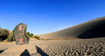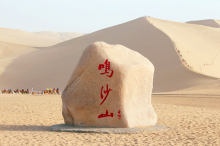 鳴沙山以沙動成響而得名。東漢稱沙角山,俗名神沙山,晉代始稱鳴沙山,其山東西長40余公里,南北寬約20公里,主峰海拔1715米。峰巒危峭,山脊如刃,人馬踐墜,經(jīng)宿復(fù)初;人乘沙流,有鼓角之聲,輕如絲竹,重若雷鳴,故稱“沙嶺晴鳴”,為敦煌八景之一。