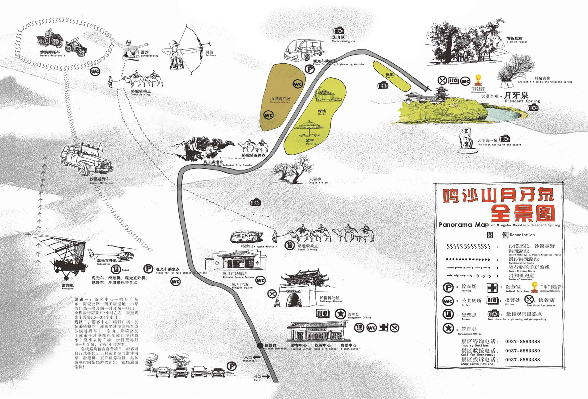 | 敦煌鳴沙山月牙泉景區(qū)位于甘肅省敦煌市城南5千米處,景區(qū)范圍界定為76.82平方千米,核心景區(qū)面積界定為12.79平方千米,規(guī)劃外圍控制地帶面積為136.04平方千米。景區(qū)內(nèi)地貌主要有大、小泉灣和周圍的鳴沙山組成。小泉灣是間于東沙山與北沙山的洼地,主要用于辦公和生活區(qū)。大泉灣是北沙山與南山之間的洼地,月牙泉和月泉閣等古建筑群分布其內(nèi),也是景區(qū)的核心。