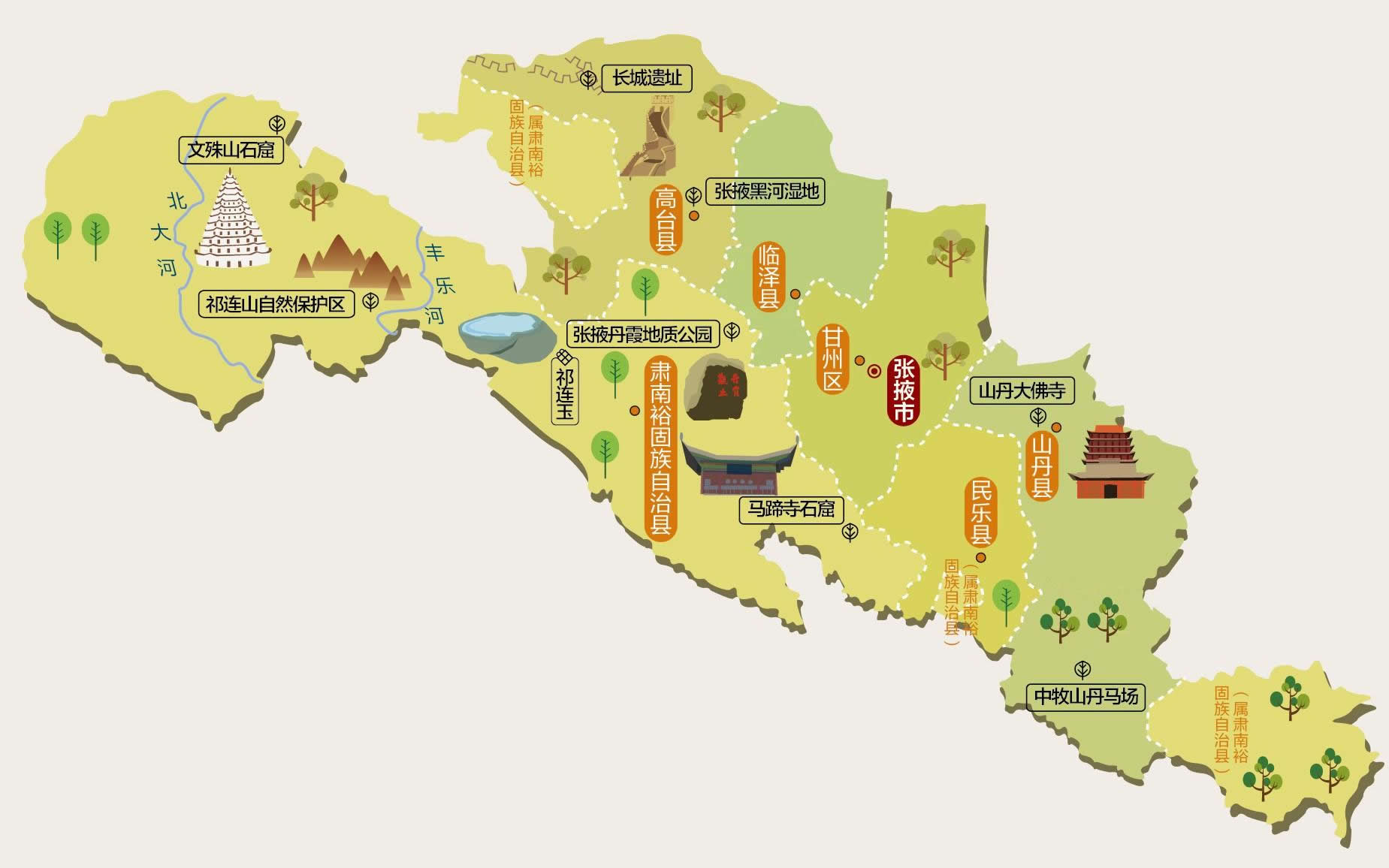 ·鎮(zhèn)遠樓 ·肅南康隆寺獵場 ·張掖市森林公園 ·東大山 ·龍首山 ·道巷廟 ·甘州古塔 ·諸葛樓 ·東山寺和西武當 ·黑水國遺址及漢墓群