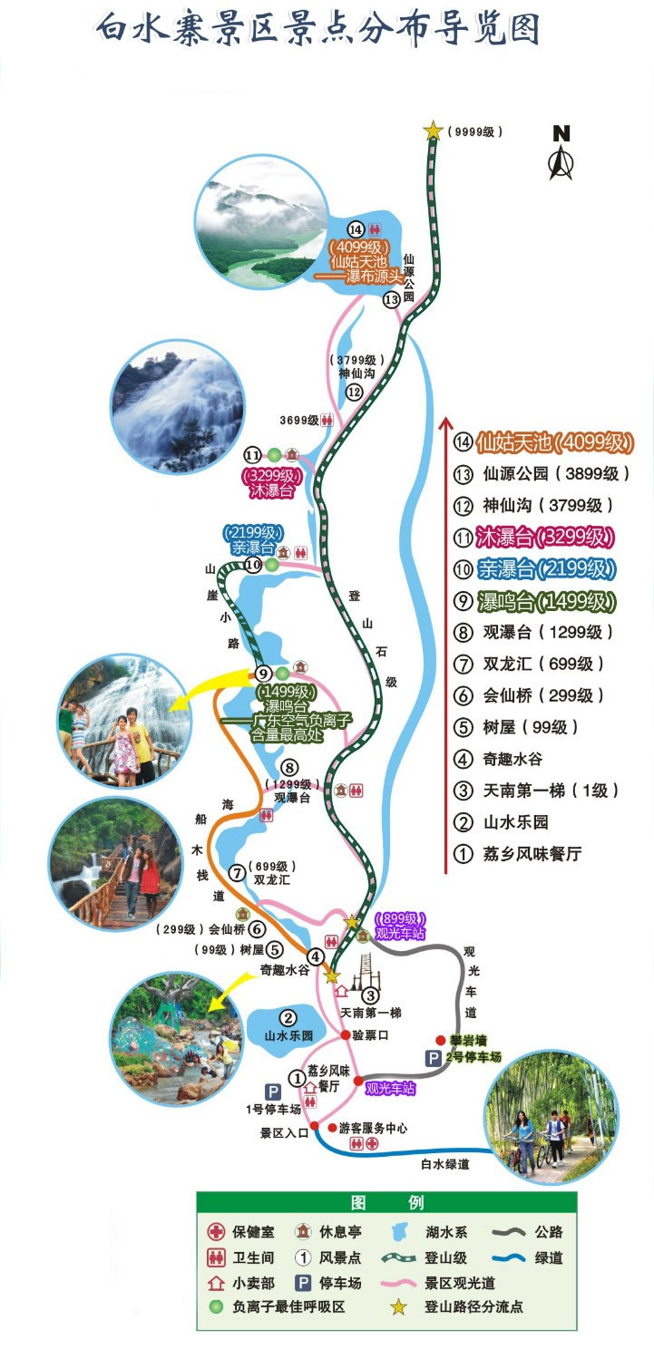 白水寨圍繞白水仙瀑及奇峰秀色,建有9999級(jí)登山步徑,總長(zhǎng)6.6公里,19000多步,橫跨三座高山,邊接二大天池,號(hào)稱“天南第一梯”,取“勝境尋仙”、“悠閑怡景”、“知難而上”、“勇士進(jìn)取”、“登高攬勝”和“登峰如愿”之義,分“尋仙、怡景、知難、攬勝、勇士和登峰”六段梯,拾級(jí)而上盡覽天南第一梯奇觀,盡享休閑健身觀光之樂(lè),百般風(fēng)情皆可體驗(yàn)。走過(guò)六段梯,登上9999,心想事成,強(qiáng)身健體,六六大順,長(zhǎng)長(zhǎng)久久。
