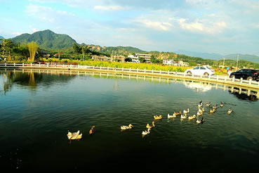 臺(tái)灣度假村位于長潭旅游區(qū)入口處的虎形山,占地面積218畝,主要開發(fā)廣場(chǎng)、朝圣區(qū)、游樂園、賓館、別墅、展覽館、科技城、美食一條街、農(nóng)業(yè)觀光和苗圃等項(xiàng)目。為一富娛樂性、知識(shí)性、觀賞性之休閑場(chǎng)所。1998年11月動(dòng)工,1999年,度假村建成戲水樂園、滑草坪、親子園地、世界蝴蝶館,此館擁有全國最多的蝴蝶種類,為廣東省最大最具規(guī)模的觀賞樂園。此外還成功引種臺(tái)灣名優(yōu)稀特水果火龍果。臺(tái)灣度假村風(fēng)光旖旎,富有詩情畫意,依山構(gòu)筑的山門別具一格,其景觀廣場(chǎng)、游樂園、朝圣區(qū)、科技城錯(cuò)落在山水、綠樹之間,水色塋潔,光可照人。